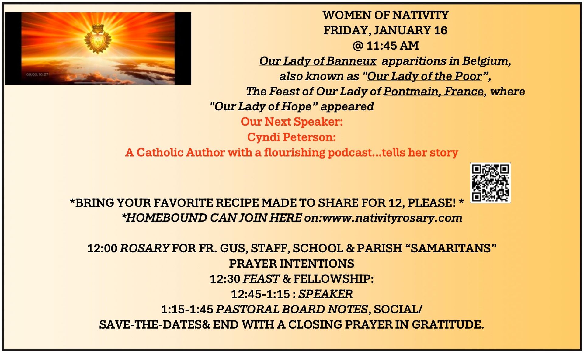 12:00 ROSARY ~ 12:30 FEAST AND FELLOWSHIP ~ 12:45-1:15 PRESENTATION ~